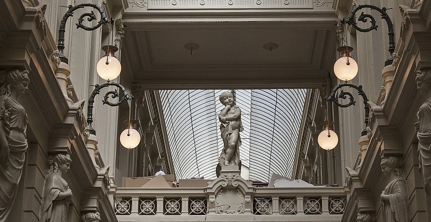 Zicht op de glazen overkapping en de binnengevels