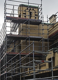 gevel met klok, in de steigers